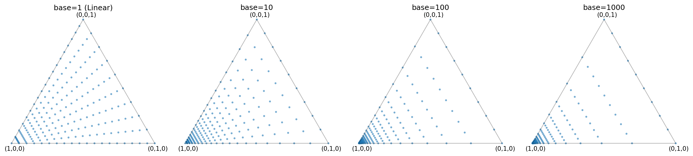reverse_logspace()routine generatesn_lambdas - 1values of \(w_1 \in [0, 1)\) that serve as \(w_1\)-levels for iso-\(w_1\) leaves, including \(w_1 = 0\) (which lies on the null-model base edge and corresponds to \(\lambda = \infty\)) and excluding the data-fidelity vertex at \(w_1 = 1\). The vertex at \(w_1 = 1\) (i.e. \(\lambda = 0\)) is appended separately. As \(w_1\) increases from 0 towards 1, these levels move from the base edge into the simplex interior towards the data-fidelity vertex. Since \(\lambda = (1 - w_1) / w_1\) is finite only for \(w_1 > 0\), all finite values of \(\lambda\) arise from \(0 < w_1 < 1\). The log spacing in \(w_1\) produces more \(w_1\) levels close to the data-fidelity vertex and therefore near \(\lambda = 0\). The steepness of this clustering is controlled by thebaseparameter:base=1gives uniform spacing in \(w_1\), while larger values concentrate points further towards \(w_1 = 1\) (i.e. towards smaller \(\lambda\)).Uniform spacing along \(\alpha\) – for each \(w_1\) level, the