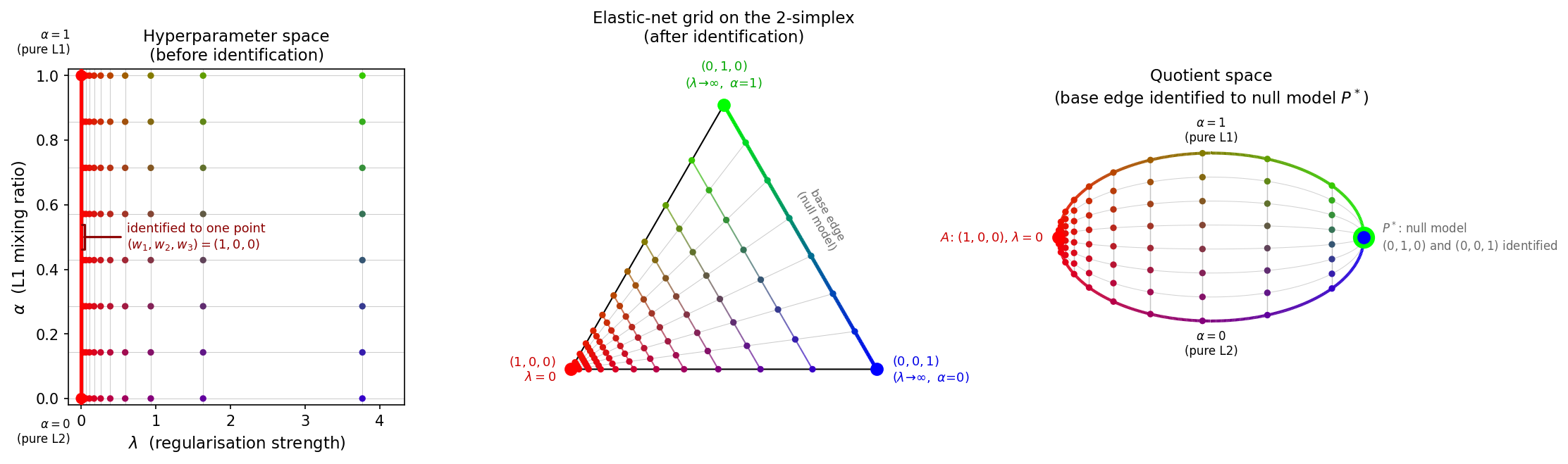 Fig. 10 All points are colored by \((w_1, w_2, w_3) \mapsto (R, G, B)\), so the same weight vector has the same color in every panel. Left – The \((\lambda, \alpha)\) hyperparameter space (x: regularization strength, y: L1 mixing ratio). The red line at \(\lambda = 0\) is the identified edge; all points on it share the color \((1, 0, 0)\) = red because \(w = (1, 0, 0)\) there. Center – The 2-simplex with vertices \((1,0,0)\) at the bottom-left (red), \((0,1,0)\) at the top (green), and \((0,0,1)\) at the bottom-right (blue). The gradient right edge (green→blue) is the null-model base edge to be identified. Right – The quotient space: vertex \(A\) = \((1,0,0)\) (red) at the left, and the null-model point \(P^*\) at the right shown as a large green dot \((0,1,0)\) behind a smaller blue dot \((0,0,1)\), reflecting that both endpoints of the base edge are identified to \(P^*\).