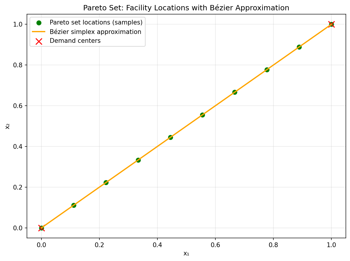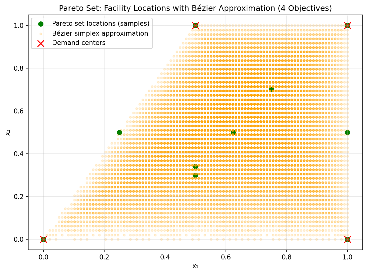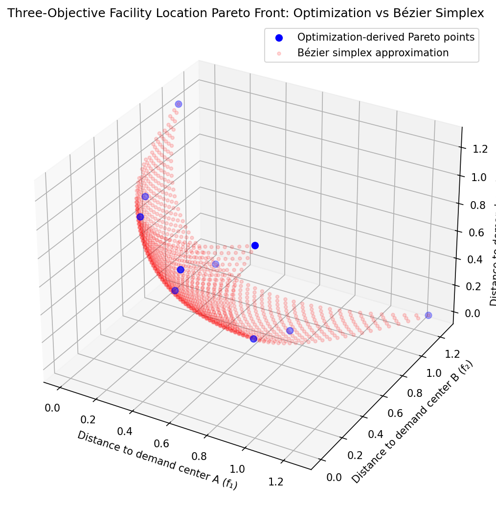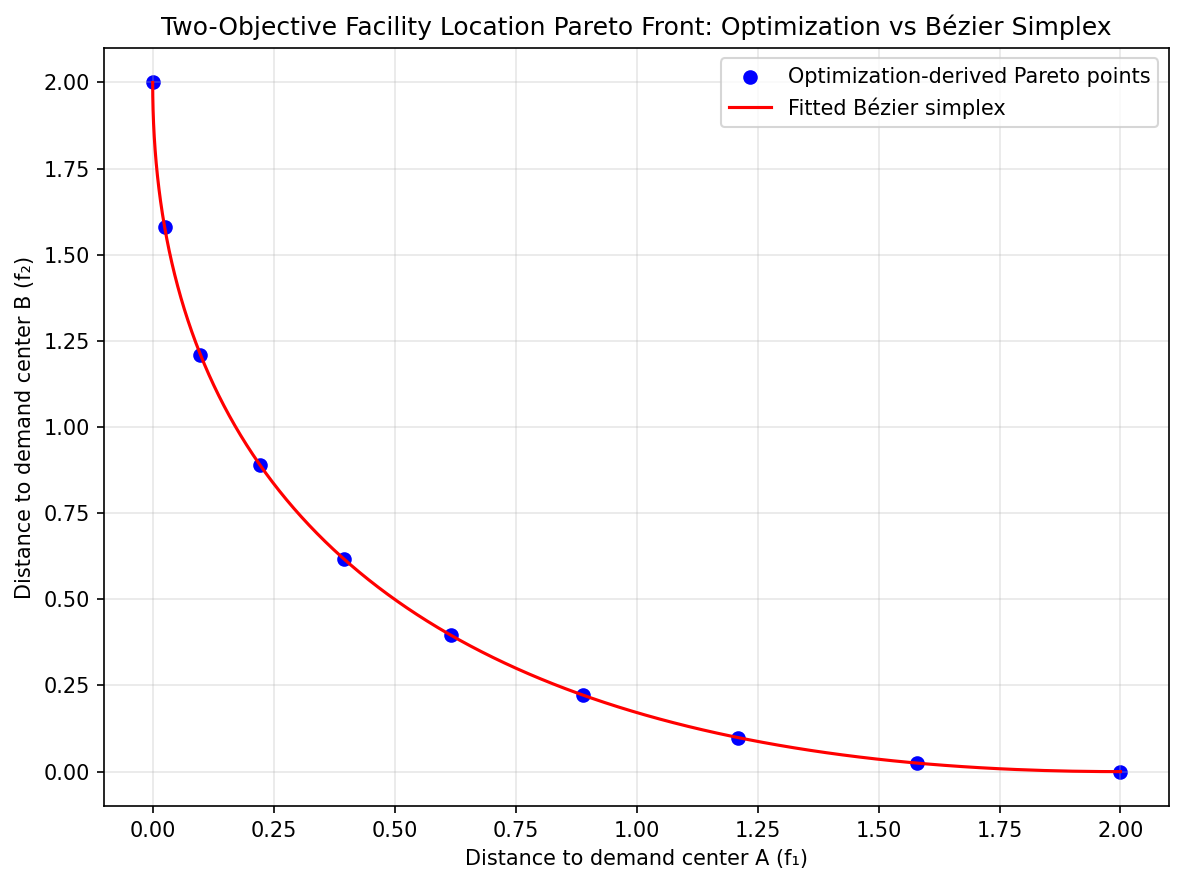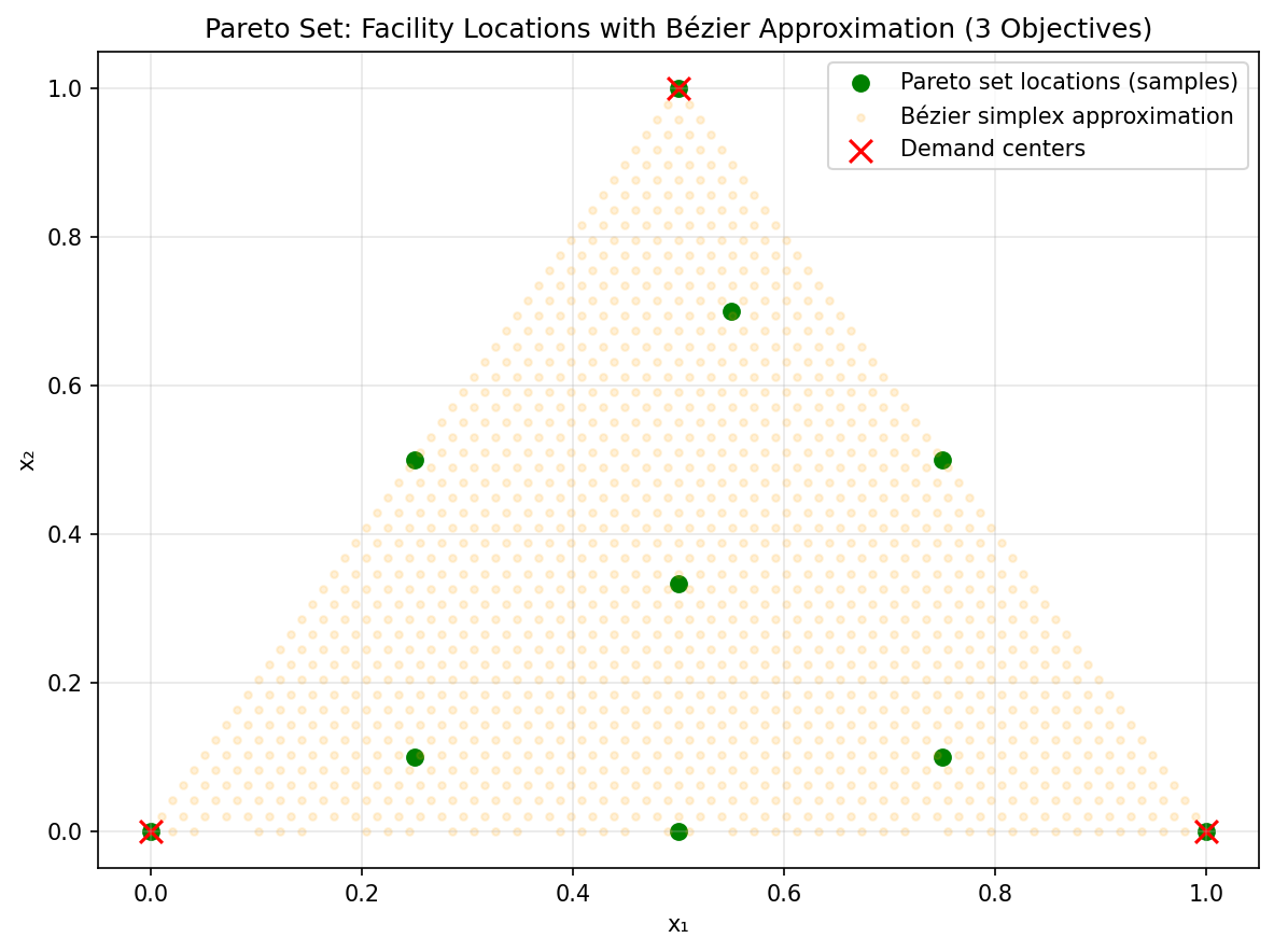 Approximating these Pareto fronts with a Bézier simplex yields a completely continuous, analytic structural location map. Planners and decision-makers are empowered to visually and analytically slide trade-off priorities—such as selectively favoring certain demand hubs—to determine the optimal coordinates seamlessly, without needing to re-solve the spatial optimization from scratch.