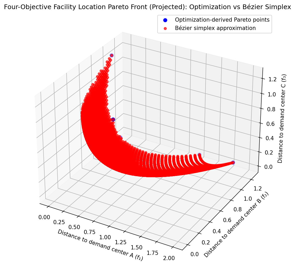 These examples confirm that Bézier simplex fitting accurately approximates multi-objective facility location trade-offs from actual optimization, scaling effectively to higher dimensions. The complete code for the two-, three-, and four-objective experiments is available in examples/generate_facility_location_pareto_2obj.py, examples/generate_facility_location_pareto_3obj.py, and examples/generate_facility_location_pareto_4obj.py, respectively.