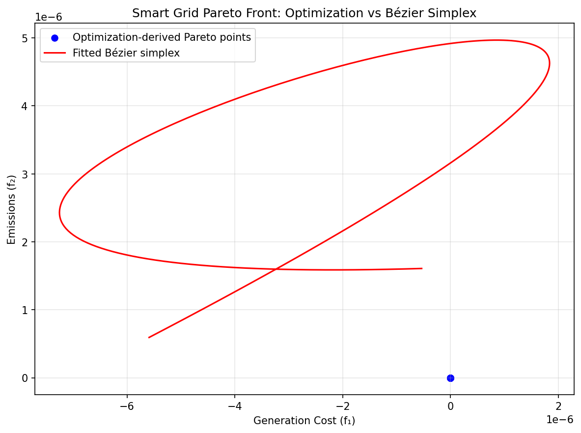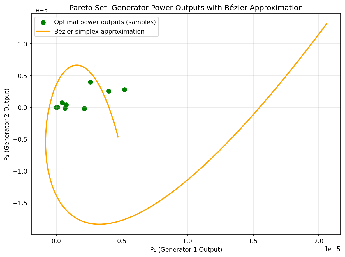 We illustrate Bézier simplex fitting on a two-generator optimal power flow problem balancing generation cost against emissions.