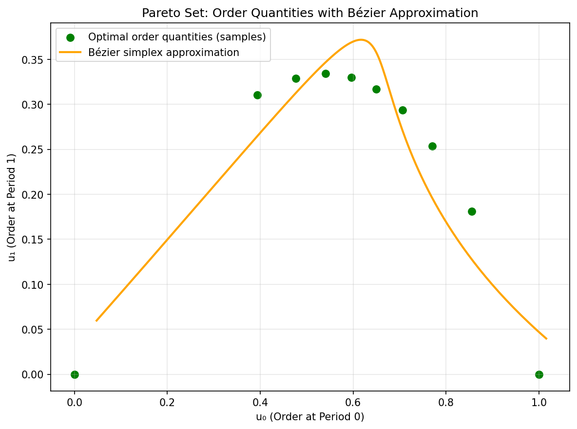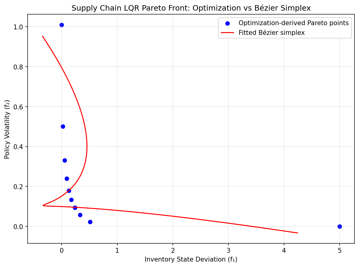 We demonstrate Bézier simplex fitting on a two-objective inventory LQR problem balancing state deviation against policy volatility over a horizon of \(H = 5\) periods.