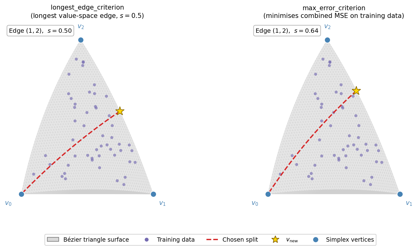 Fig. 11 Comparison of the two built-in split criteria on a degree-2 Bézier triangle (\(n_\mathrm{params}=3\)) with training data (purple dots). Leftlongest_edge_criterion selects the longest value-space edge and splits at \(s=0.5\). Rightmax_error_criterion selects the edge and split position that minimize the combined MSE on the training data; the chosen edge and \(s\) value may differ from the geometric midpoint. The dashed line shows the split and the star marks \(v_\mathrm{new}\) in both panels.
